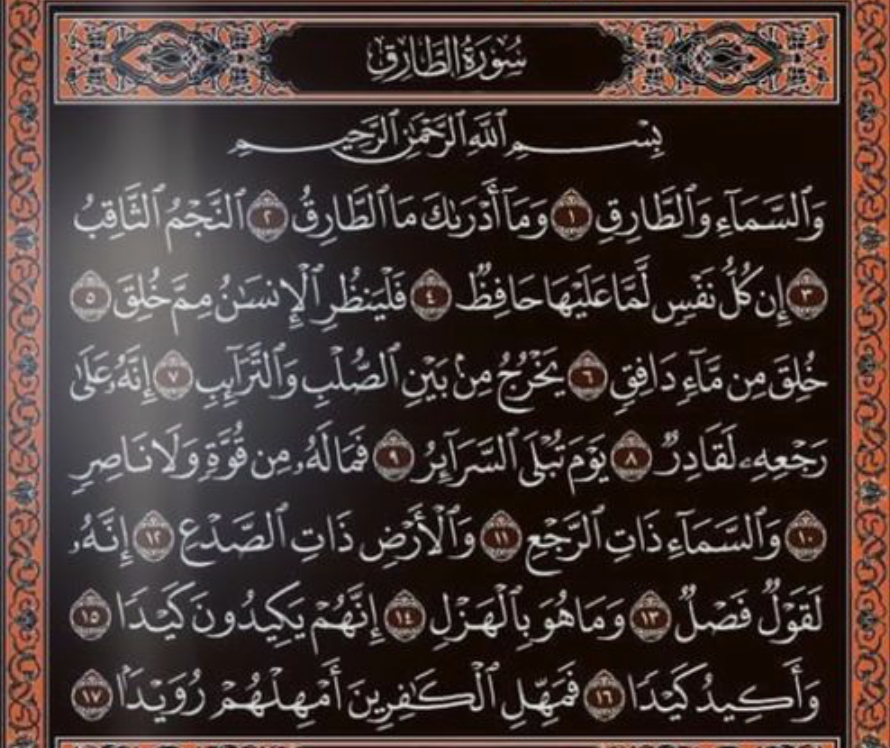 أقسم بالسماء وبالنجم الذي يظهر ليلاً وأي شيء أعلمك حقيقة هذا النجم، هُوَ الَّذِي يَنْفَذُ ضوؤه في الظلام . ما كلّ نفسٍ إلا عَلَيها حافظ من ربها ، موكّل بحراستها، وإحصاء أعمالها، وَهُم الملائكة الحفظة . فليفكر الإنسانُ مِنْ أي شيءٍ خُلق؟ خُلق الإنسانُ مِن مَاء (مَني) مُتَدفق ، يخرجُ هَذَا الماءُ مِنْ بين الصلب وعظام الصدرِ مِنَ الرجل والمرأة (الصلب هو منطقة العمود الفقري، والترائب هي عظام الصدر) .